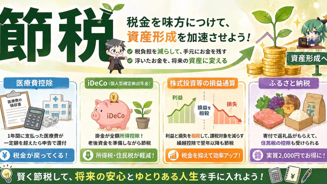 税金は大きく資産を削る厄介な存在ですので節約の一環として節税対策をしましょう。平均的な会社員を想定した場合、ざっくりの計算ですが、収入から各種控除(基礎控除、社会保険料控除など)を引いた額に対して、約20%の所得税と10%の住民税が徴収されます。30%もののお金が国や地方自治体に召し上げられるのですから税金は資産形成には大きな足かせとなります。したがって、節税できるものをきっちり把握して、お財布から出ていくお金を極力減らしましょう。節税にあたっては年末調整や確定申告は払い過ぎた税金を取り戻す機会です。税金を取り戻せる方法には以下のものが上げられます。